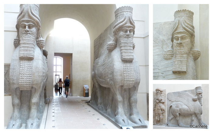 Dans la Cour dite Khorsabad, on découvre des vestiges de la ville et du palais du roi Sargon II à Dur-Sharrukin, qui fut la capitale de l’Assyrie, actuellement Khorsabad près de Mossoul en Irak, datés de 713-706 av.JC. Assez impressionnants il faut bien l’avouer, surtout sous la baie vitrée de cette cour du Louvre qui leur donne une belle luminosité …